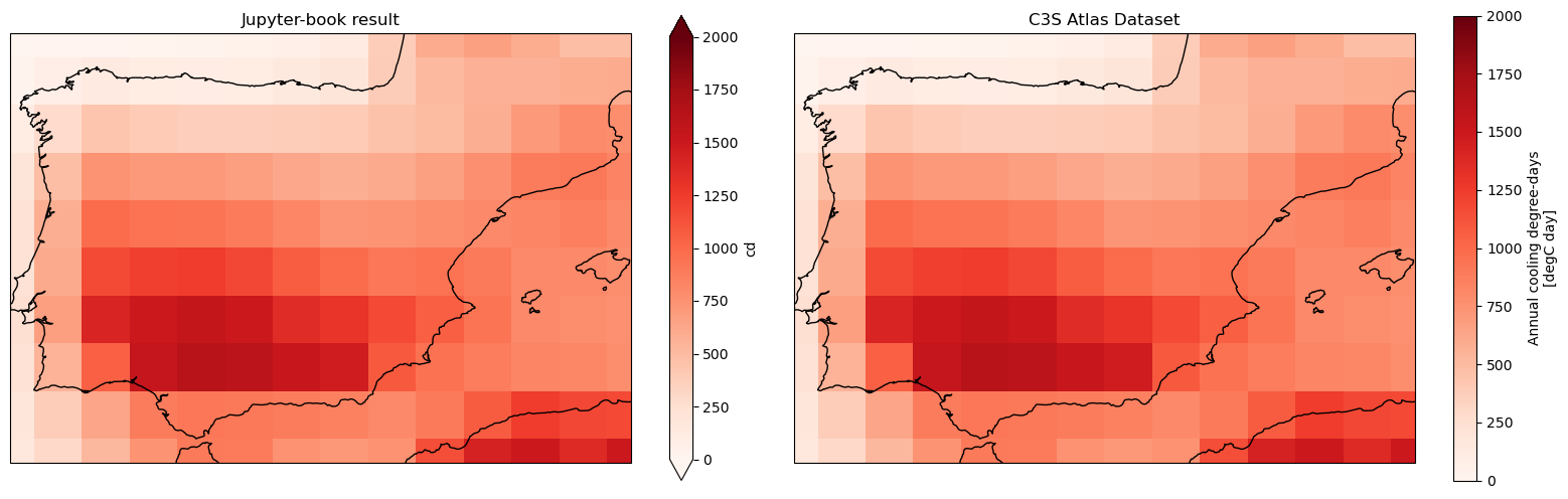 Comparison of the results obtained with present Jupyter notebook and the reference C3S Atlas Dataset underpinning the C3S Atlas. A geographical subset focusing on Spain is selected to show the results.