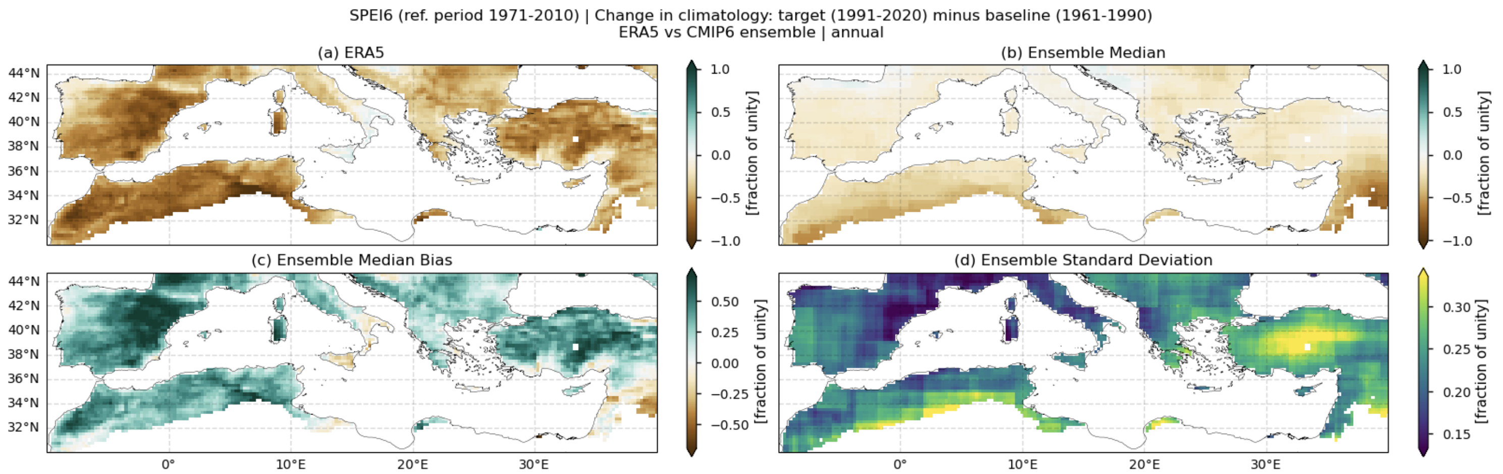Fig. 5.1.13.1 Spatial patterns of SPEI6 change over the Mediterranean region. Panels show (a) ERA5 reference, (b) CMIP6 ensemble median (median of the selected subset of models at each grid cell), (c) ensemble median bias relative to ERA5, and (d) ensemble spread (standard deviation across the selected models). SPEI6 is standardised over the reference period 1971–2010. SPEI6 change is calculated at each grid point as the difference between the monthly climatologies of the target period (1991–2020) and the baseline period (1961–1990), and then averaged to obtain the annual mean.#